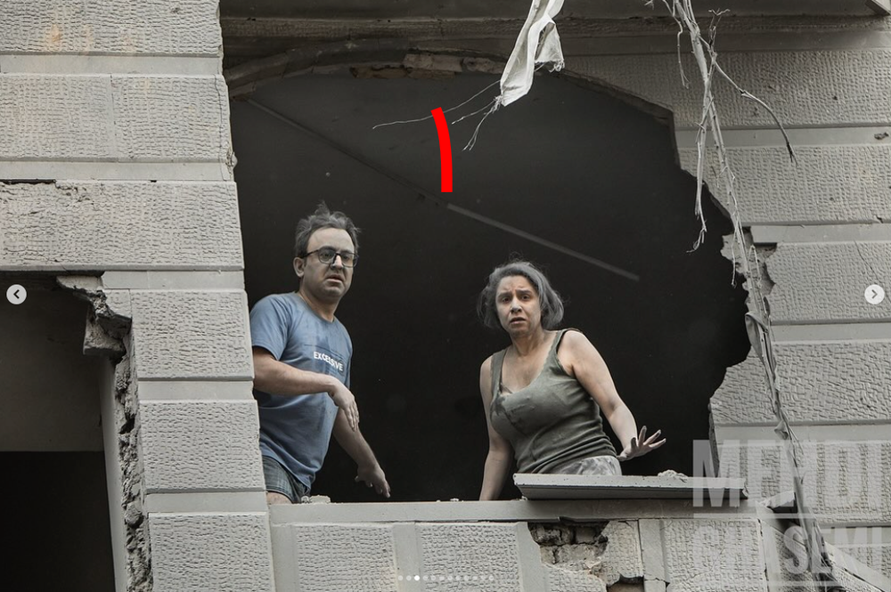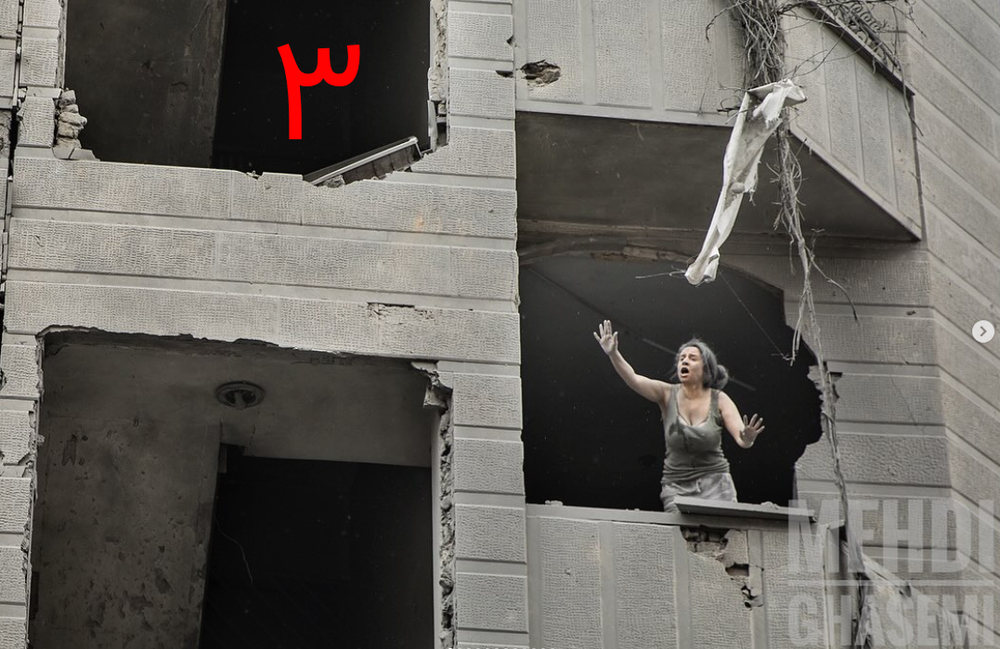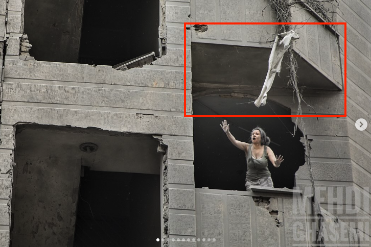 اما جدا از مقایسه چهرهها، میدانیم بمباران و حمله به خیابان مهناز در تهران، همراه با ویرانی و تلفات جانی بوده است. اگر فرض کنیم عکاس یا رسانهای به دنبال پروپاگاندا یا استفاده از بازیگر باشد، دور از ذهن است در شرایطی که اجزای مختلفی چون پیکرهای در کاور و اهالی محله در آن حضور دارند، بخواهد از بازیگر یا بازیگرانی در آن صحنه استفاده کند.