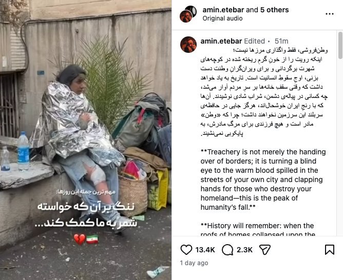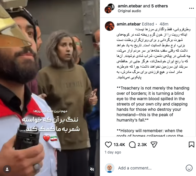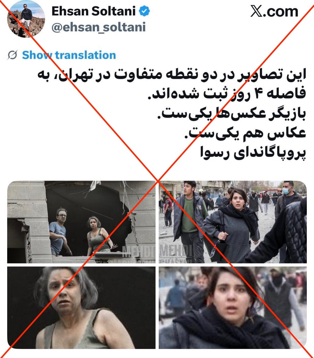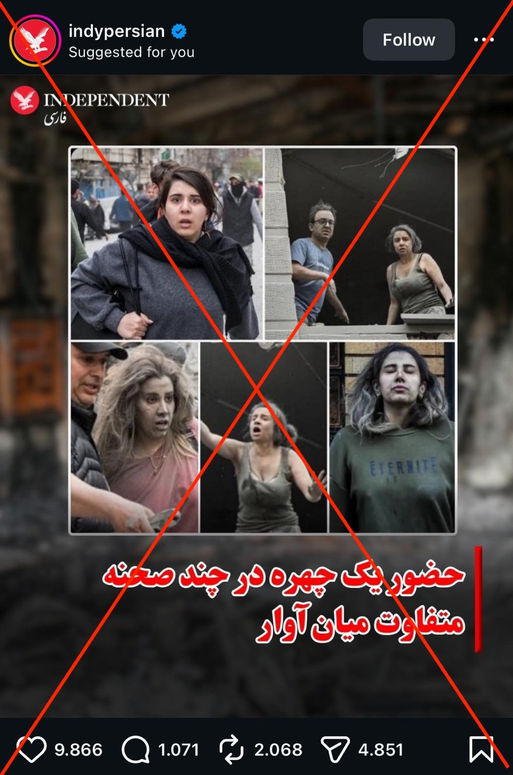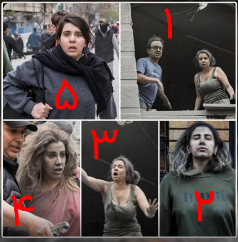 در نمونهای دیگر، ایندیپندنت فارسی (لینک پستی که در حال حاضر پاک شده است) با انتشار یک کلاژ که پنج عکس در آن قرار دارد نوشت: «حضور یک چهره در چند صحنه متفاوت میان آوار»