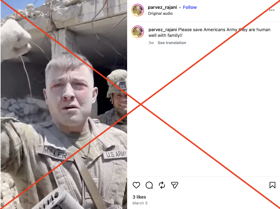 ویدیویی در شبکههای اجتماعی در حال انتشار است که یک سرباز آمریکایی را در حال صحبت نشان میدهد و ادعا شده که در حال التماس و گریه برای بازگشت است (لینک ۱، لینک ۲، لینک ۳).