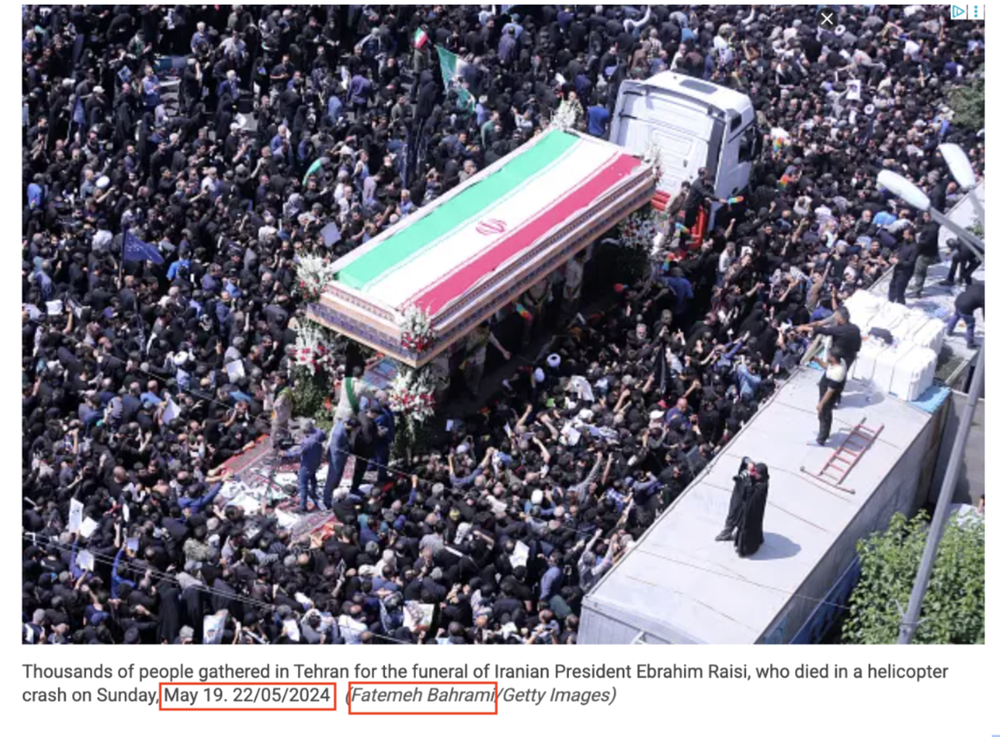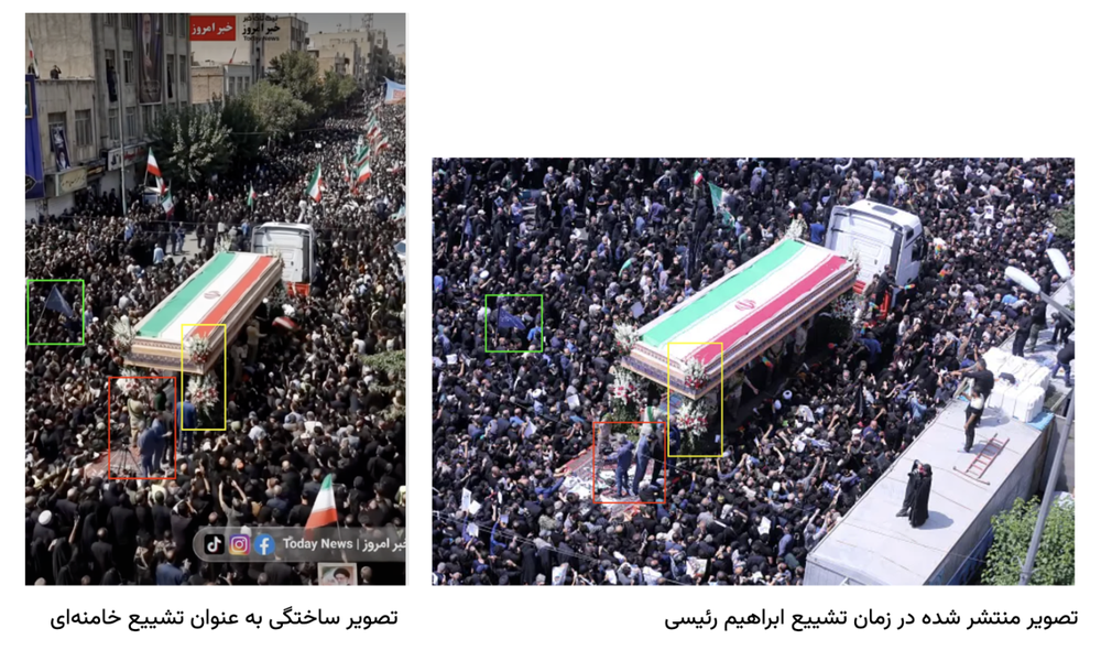 بررسی جزئیات تصویری که در رسانهها همزمان با تشییع ابراهیم رئیسی در تهران منتشر شد و مقایسه آنها با ویدیویی که ادعا میشود مربوط به تشییع علی خامنهای است نشان میدهد که ویدیوی دوم با کمک ابزار هوش مصنوعی از روی تصاویر اول ساخته شده است.