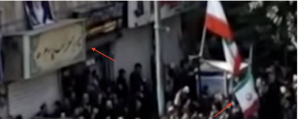 همچنین تابلوهای مغازهها که در تصویر اصلی وجود ندارد، در ویدیوی ساختگی اضافه شده که قابل خواندن نیستند. این یکی از ایرادهای متداول در تصاویر ساخت هوش مصنوعی است. یک پرچم ایران هم در میانه تصویر به هم ریخته و نادرست است.