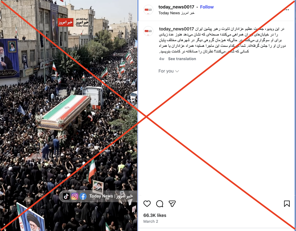 در توضیح این ویدیو نوشته است: «در این ویدیو، جمعیت عظیم عزاداران تابوت رهبر پیشین ایران در خیابانهای تهران همراهی میکنند؛ صحنهای که نشان میدهد هنوز عده زیادی برای او سوگواری میکنند، در حالیکه همزمان گروهی دیگر پایان دوران او را جشن گرفتهاند».