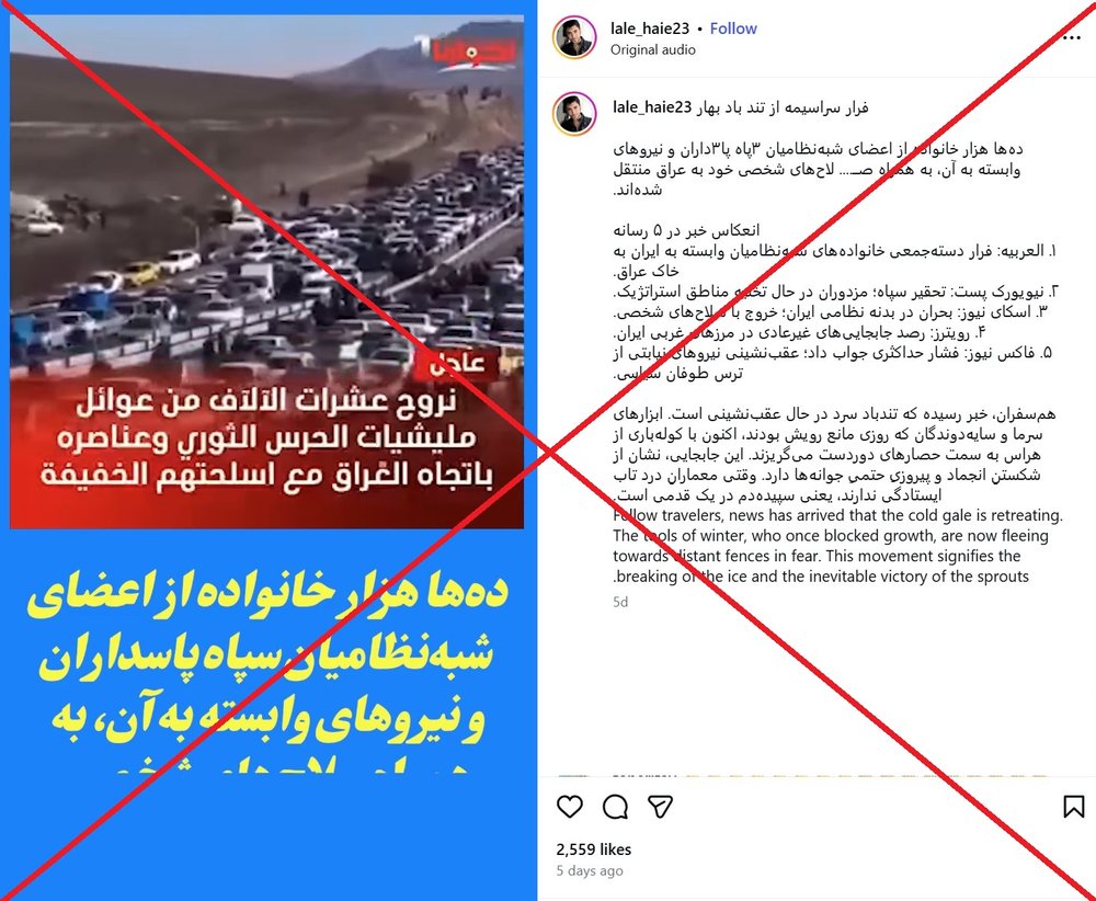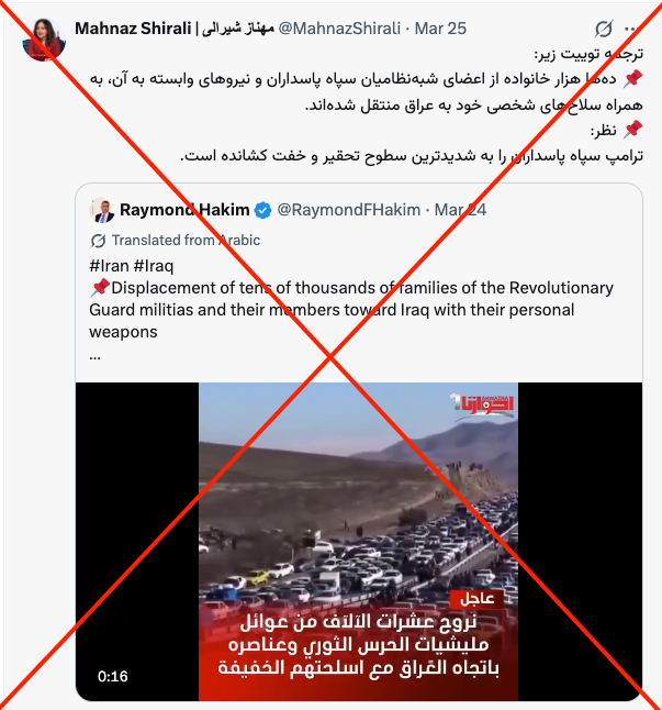 این روزها، ویدیویی در شبکههای اجتماعی منتشر شده که ادعا میکند مربوط به فرار گسترده نیروهای نظامی سپاه پاسداران به خاطر ترس از شرایط جنگی است. (لینک۱ ، لینک۲، لینک۳ ، لینک۴ ، لینک۵)