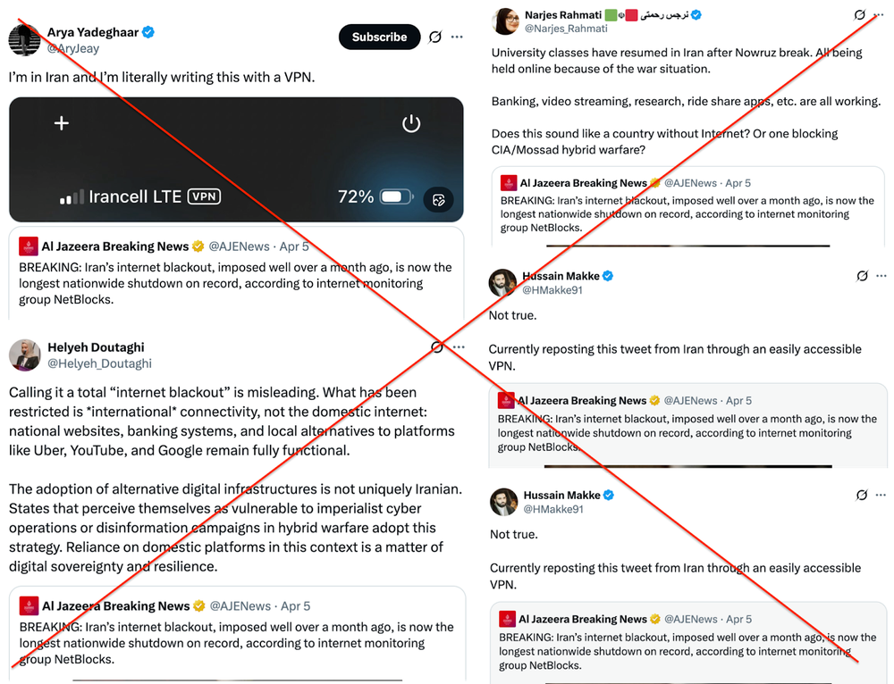 مضمون همه این توییتها این است که اینترنت در داخل ایران برقرار است. مردم کارهای روزمرهشان مثل تحقیق، تماشای ویدئو را به راحتی انجام میدهند و فقط راه نفوذ «موساد و CIA» بسته است. بعضی هم مدعی شدهاند که به راحتی از طریق VPN در شبکه اجتماعی X توییت میکنند که هیچ کدام از این موارد واقعیت ندارند.