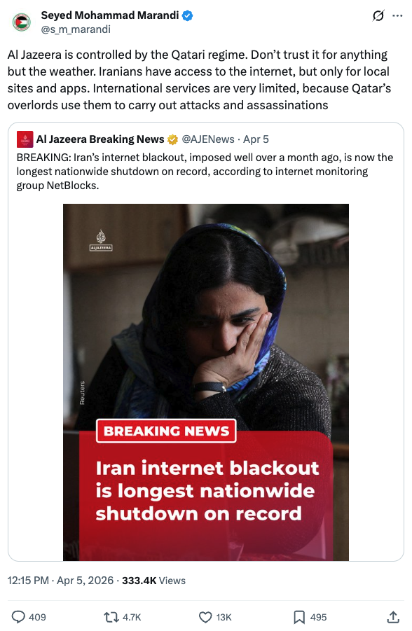 محمد مرندی، حامی و مبلغ جمهوری اسلامی ایران در شبکههای اجتماعی و رسانههای انگلیسیزبان، در واکنش به خبر الجزیره درباره رکوردشکنی قطع اینترنت در ایران، در شبکه اجتماعی X نوشته است: