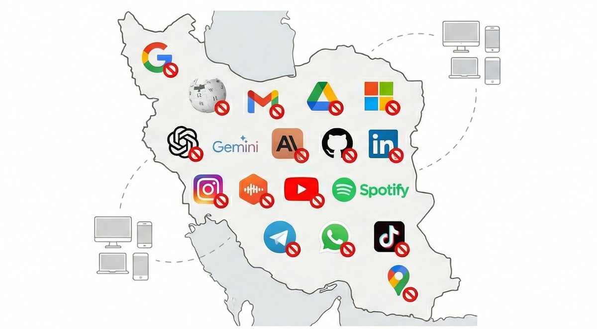 مقامهای حکومت ایران امکان دسترسی مردم به ابزارهای هوش مصنوعی و مدلهای زبانی مثل ChatGPT ،Gemini و Claude را قطع کردهاند. توسعهدهندگان نرمافزار و زیرساخت امکان استفاده از Github را ندارند. دسترسی به شبکههای حرفهای و کاریابی مثل Linkedin برای مردم قطع شده استفاده از پلتفرمهای عادی مثل Youtube ،Spotify و Castbox حتی با استفاده از VPN برای مردم ایران ممکن نیست.