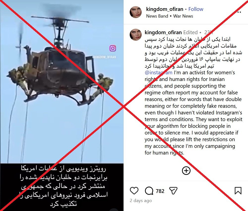 ویدیویی در شبکههای اجتماعی منتشر شده که ادعا میشود مربوط به عملیات نجات خلبان آمریکایی در ایران است. (لینک۱ ، لینک۲ ، لینک۳ ، لینک۴ ، لینک۵)