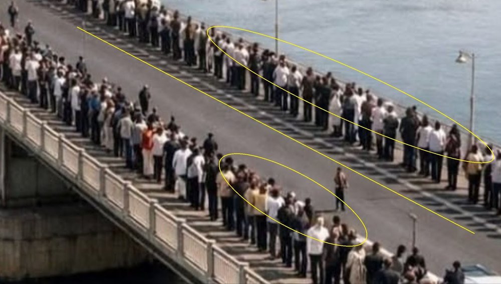 علاوه بر این شواهد دیگری وجود دارد که نشان میدهد این ویدیو واقعی نیست. سایه افراد ایستاده در سمت راست پل به شکل غیرعادی منظم است؛ گویا همه افراد همقد هستند. همین طور صورت تقریبا تمام حاضرین مخدوش است و هیچ صورتی قابل تشخیص نیست.