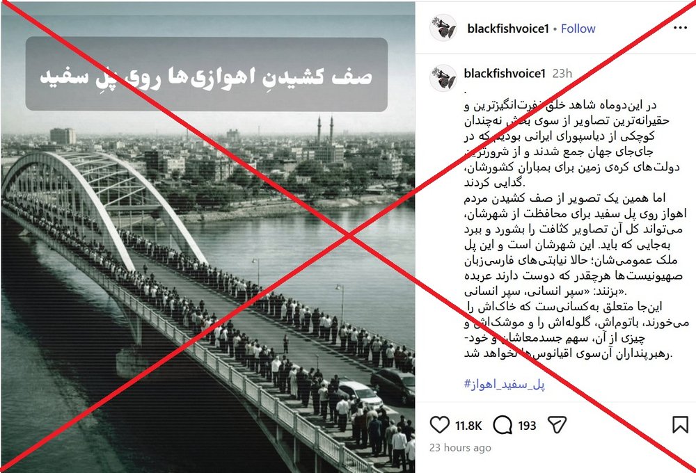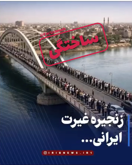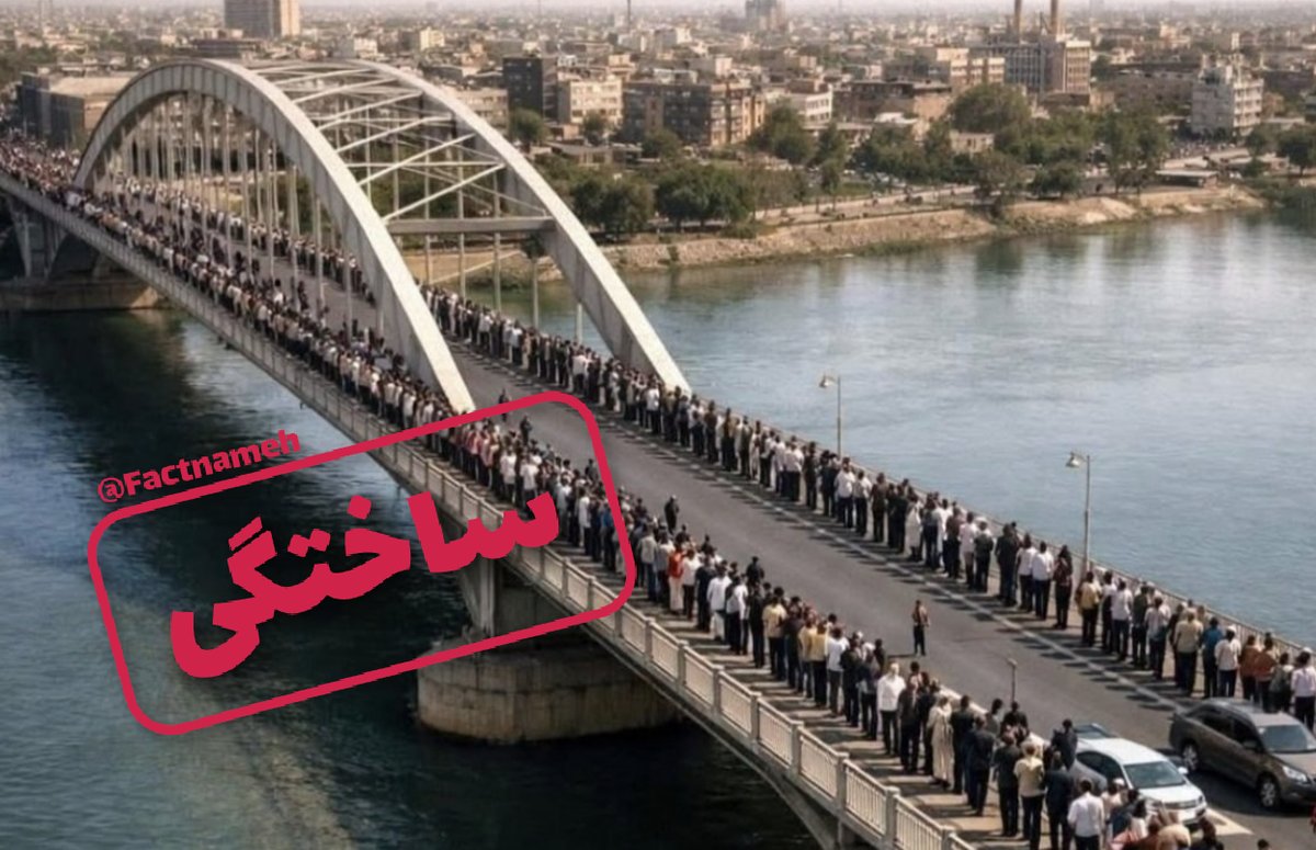 بنابراین فکتنامه به ادعای زنجیره انسانی روی پل سفید کارون که در یک تصویر ساختگی نمایش داده میشود، نشان «نادرست» میدهد.