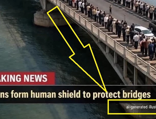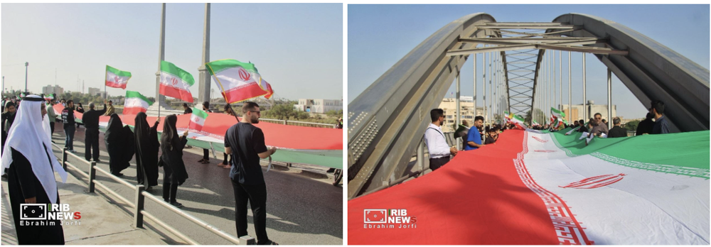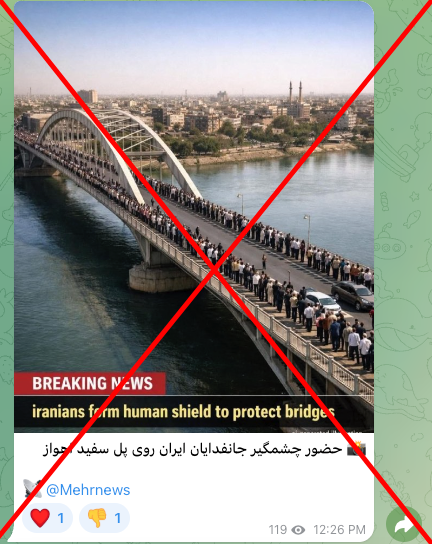 در این تصویر گروهی از افراد ایستاده را میبینیم که ظاهرا برای پیشگیری از اجرای تهدید آمریکا به حملات گسترده به پلهای ایران روی پل سفید شهر اهواز ایستادهاند. این تصویر در شبکههای اجتماعی رسانههای داخلی نیز منتشر شده است. نسخههایی با لوگوی صدا و سیما نیز دیده میشود.