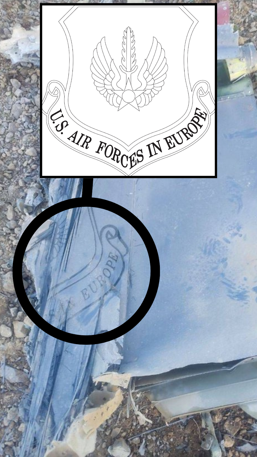 ۳. در تصاویر میتوان نشان فرماندهی نیروی هوایی آمریکا در اروپا را دید که بخشهایی از آن بر روی سکان عمودی آسیبدیده قابل تشخیص است.