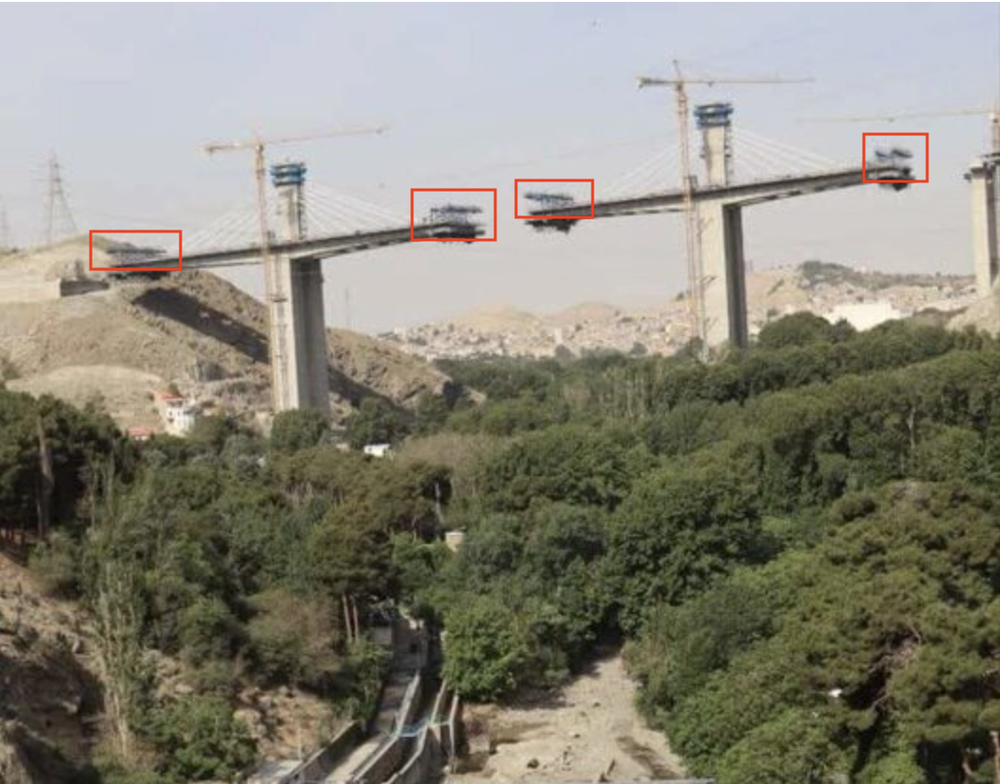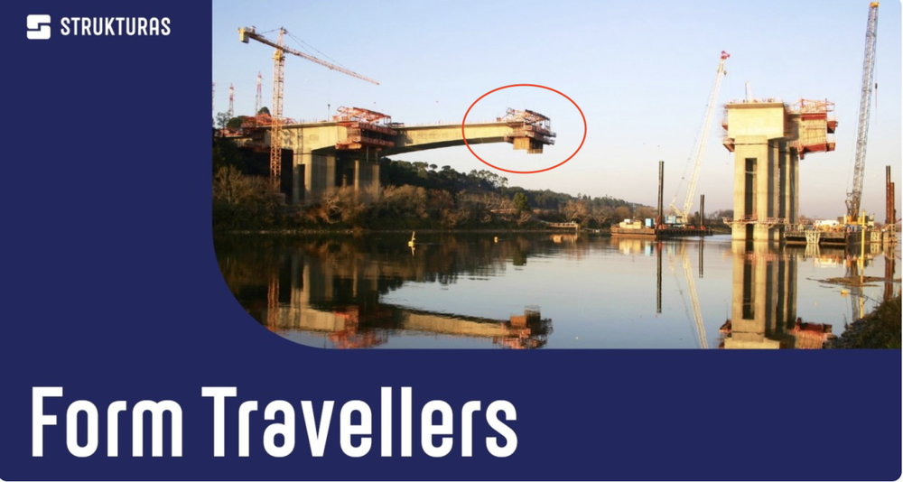 بخشهای که در تصاویر بالا مشخص شدهاند تجهیزات فرم تراولر (Form Traveler) هستند؛ تجهیزات سازهای پیشرفته و متحرکی که برای ساخت پلهای بتنی با دهانه بلند استفاده میشوند.