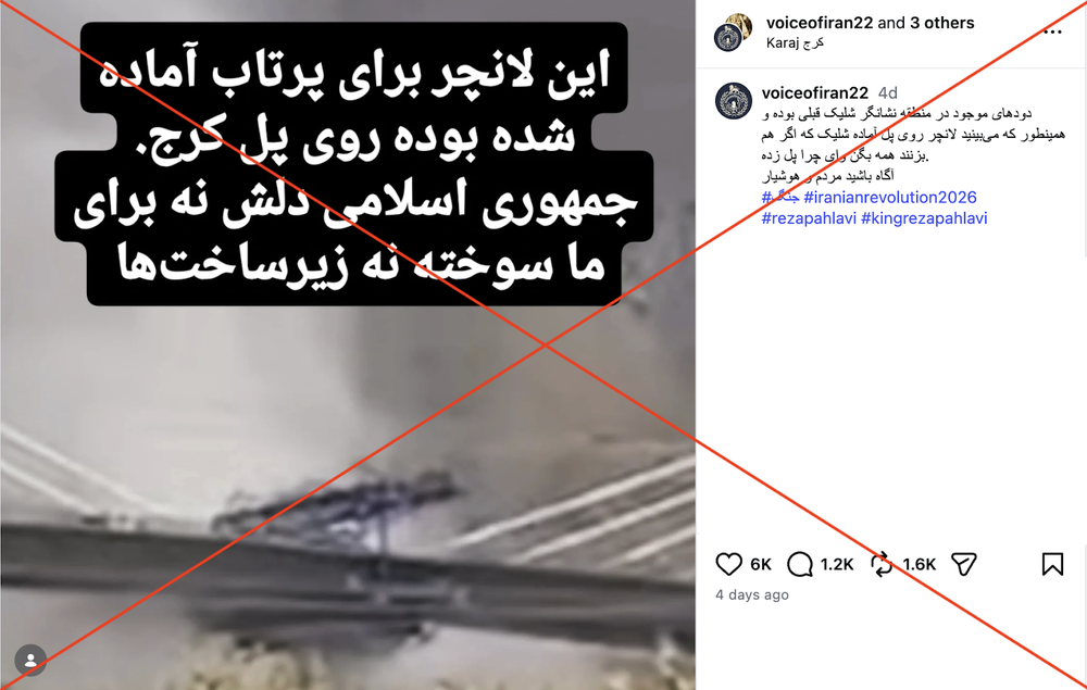 در شبکههای اجتماعی خبری به همراه یک عکس دست به دست شده که در آن ادعا شده روی پل «بی۱» کرج که روز سیزده فروردین مورد حمله آمریکا قرار گرفت، لانچر حمل موشک قرار داشته است. (لینک ۱، لینک ۲، لینک ۳، لینک ۴)