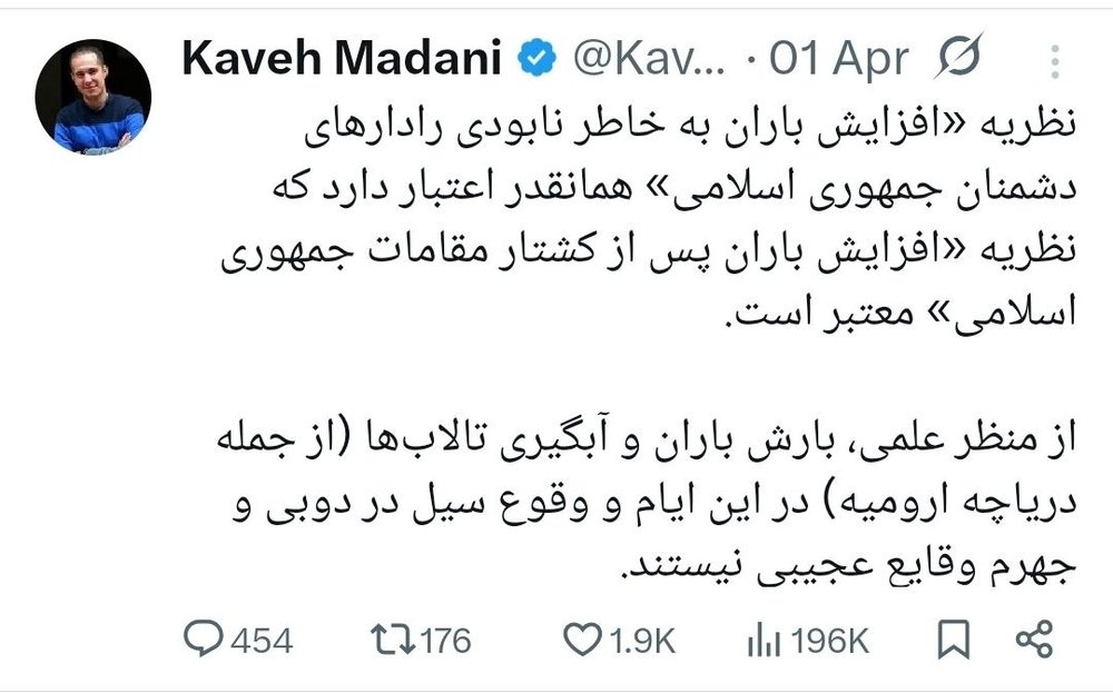کاوه مدنی مدیر موسسه آب، محیط زیست و بهداشت دانشگاه سازمان ملل متحد در توییتی ارتباط «نابودی رادارهای دشمنان جمهوری اسلامی» و افزایش میزان بارندگی را بیاعتبار دانست.