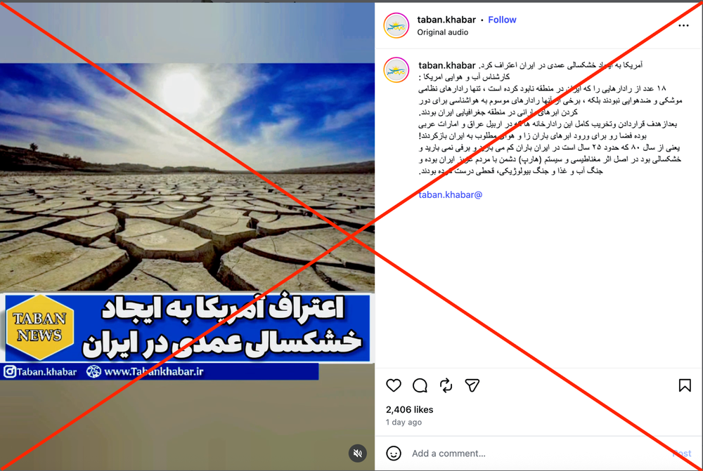 « آمریکا به ایجاد خشکسالی عمدی در ایران اعتراف کرد. ۱۸ عدد از رادارهایی را که ایران در منطقه نابود کرده است، تنها رادارهای نظامی موشکی و ضدهوایی نبودند بلکه، برخی از آنها رادارهای موسوم به هواشناسی برای دور کردن ابرهای بارانی در منطقه جغرافیایی ایران بودند. بعد از هدف قرار دادن و تخریب کامل این رادارخانه ها که در اربیل عراق و امارات عربی بوده فضا رو برای ورود ابرهای باران زا و هوای مطلوب به ایران باز کردند!