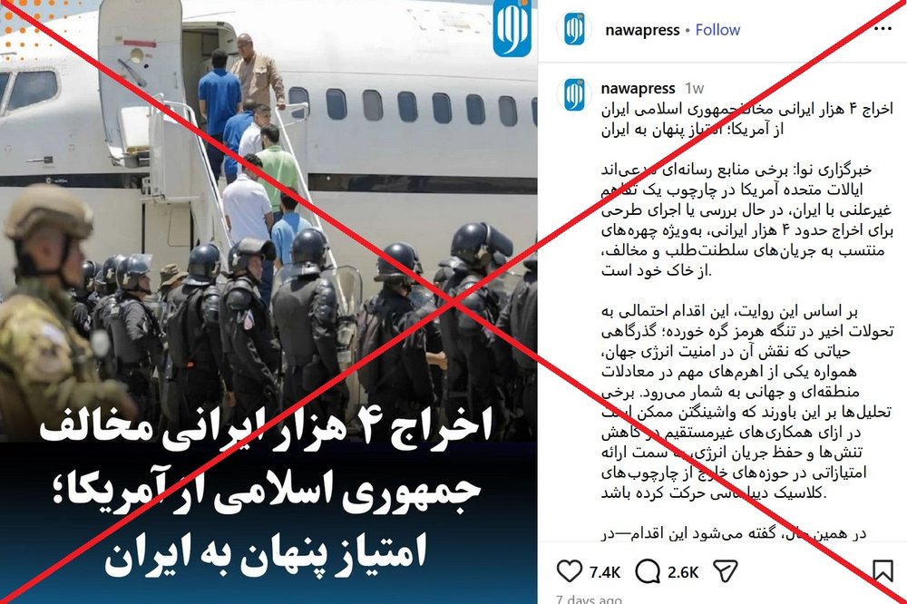 شایعهای در شبکههای اجتماعی منتشر شده که میگوید ۴۰۰۰ مخالف سیاسی جمهوری اسلامی از خاک آمریکا اخراج میشوند. (لینک۱ ، لینک۲ ، لینک۳ ، لینک۴ ، لینک۵)