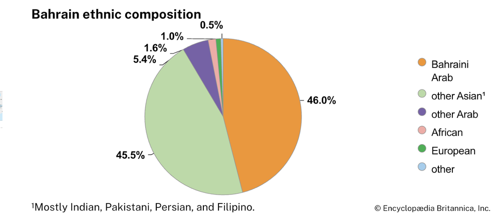 تقریبا نیمی از جمعیت بحرین، عرب هستند و بیشتر ساکنان شهروندان بومیاند، اما برخی نیز فلسطینی، عمانی یا سعودی هستند. ساکنان متولد خارج که حدود نیمی از جمعیت را تشکیل میدهند، عمدتا از ایران، هند، پاکستان، بریتانیا و ایالات متحده هستند. حدود سهپنجم نیروی کار نیز متولد خارج از بحرین است.