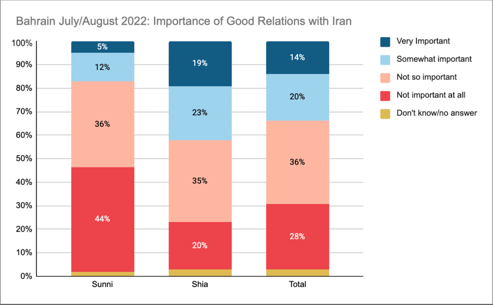از سوی دیگر، حدود نیمی از سنیها (۵۲٪) و نیز ۴۲٪ از شیعیان بحرین، روابط خوب با آمریکا را مهم میدانند.