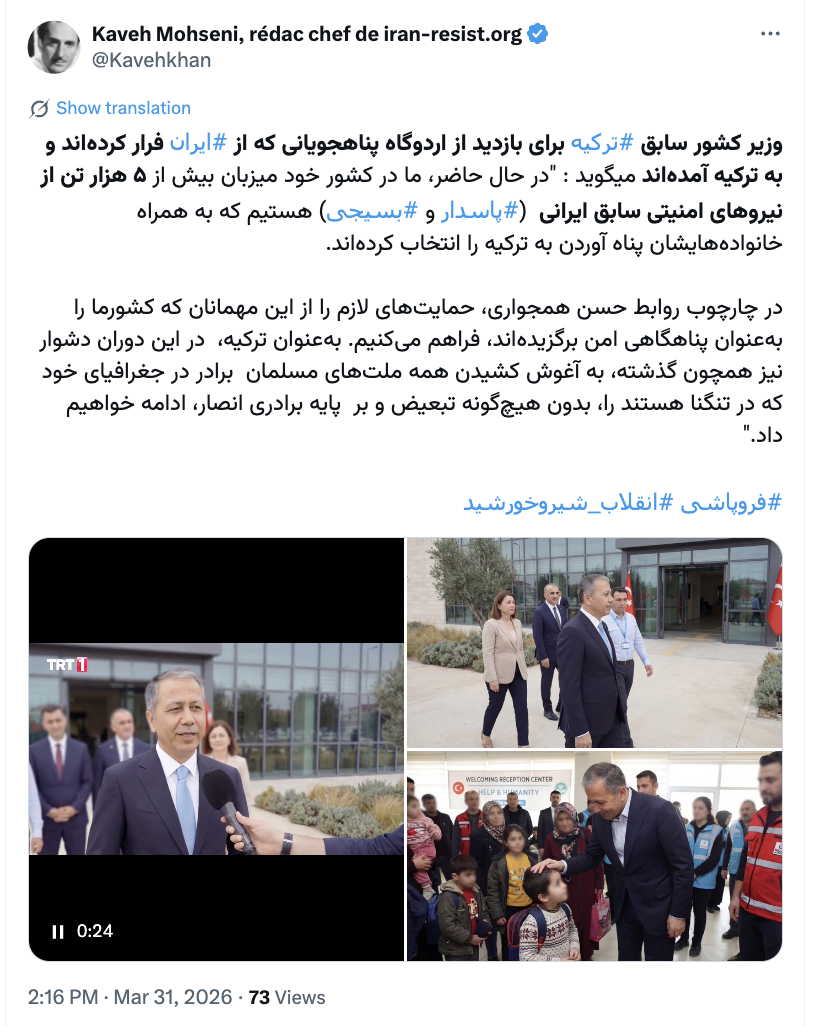 در هیچ یک از مصاحبههای او یا منابع دیگر اشارهای به ورود «نیروهای امنیتی ایران و خانوادههایشان به ترکیه» به عنوان پناهنده نشده است.