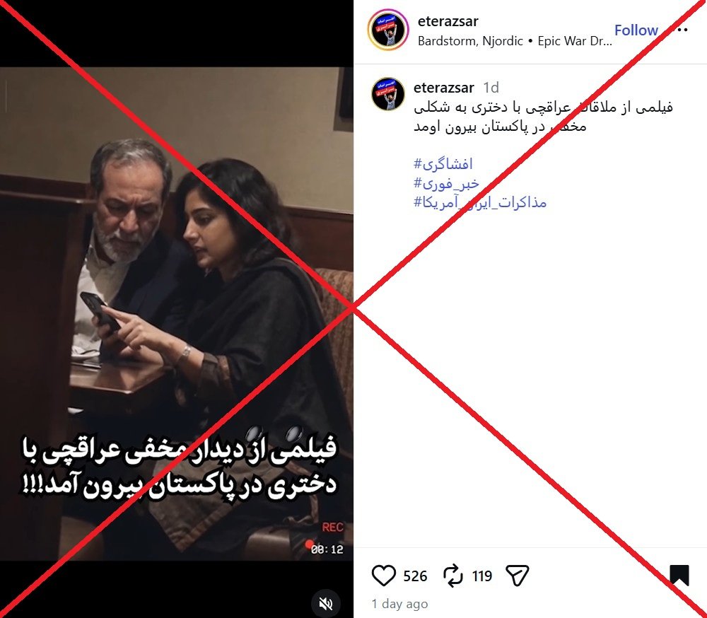 ویدیویی در شبکههای اجتماعی منتشر شده که ادعا میکند مربوط به دیدار مخفیانه عراقچی با یک زن در پاکستان است. (لینک۱ ، لینک۲ ، لینک۳ ، لینک۴ ، لینک۵)