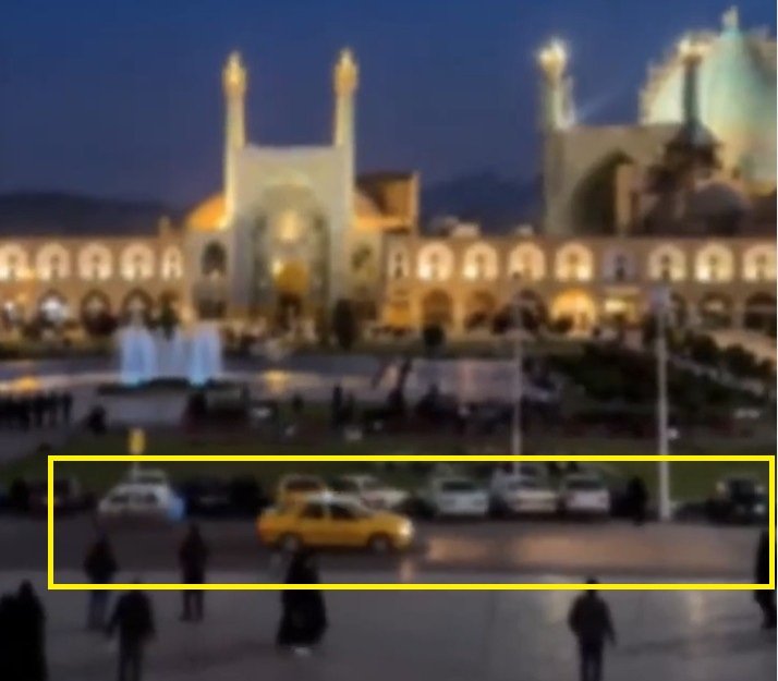 در ابتدای ویدیو خودروهایی را میبینیم که در محوطه میدان در حال تردد یا در محدودهای در وسط میدان توقف کردهاند. فارغ از ظاهر غیرعادی خودروها، تردد و ورود وسایل نقلیه اعم از شخصی یا تاکسی به محدوده میدان نقش جهان ممنوع است و محلی (مانند آنچه در ویدیو میبینیم) برای پارک خودروها در این میدان وجود ندارد.