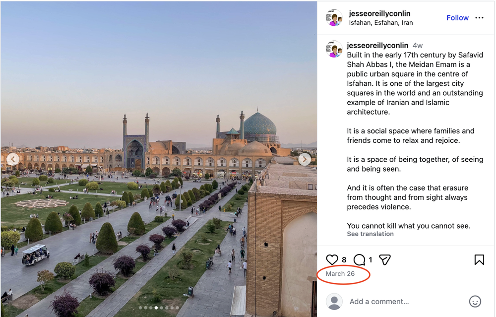 یک کاربر دیگر اینستاگرام نیز فروردین امسال تصاویر و ویدیوهایی از میدان نقش جهان منتشر کرده که اثری از داربست روی گنبد مسجد عباسی دیده نمیشود.