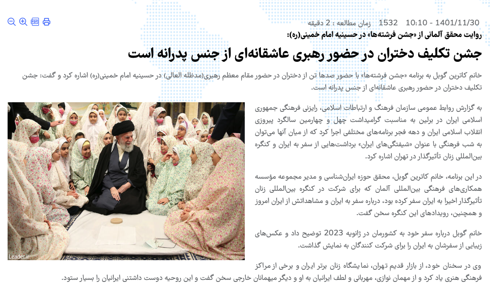 در یک نمونه دیگر، رایزنی فرهنگی ایران در آلمان به نقل از یک «محقق آلمانی»، متنی ستایشآمیز درباره جشن تکلیف (لینک بایگانی) دختران ۹ ساله در حضور خامنهای منتشر میکند.