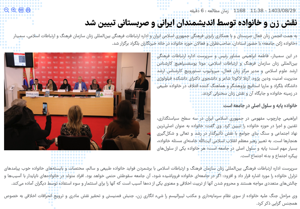 نمونهای دیگر، نشست «خانواده رُکن جامعه» (لینک بایگانی) که در محل رایزنی فرهنگی ایران در صربستان و با حضور فاطمه ابراهیمی مشاور رئیس و سرپرست اداره ارتباطات فرهنگی بینالمللی زنان سازمان فرهنگ و ارتباطات اسلامی برگزار می شود. او در این نشست، «جنبش فمینیستی و تحقیر نقش مادری و ترویج انحرافات اخلاقی به خصوص همجنسگرایی» را «جنگ علیه خانواده از سوی نظام سرمایهداری و مکتب لیبرالیسم» معرفی میکند.