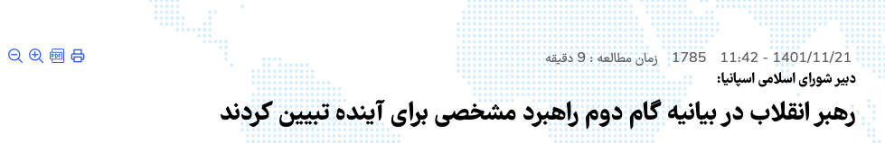 در نمونهای جداگانه ، رایزنی فرهنگی ایران در اسپانیا نشستی با موضوع «تبیین گام دوم انقلاب اسلامی با محوریت دیپلماسی فرهنگی» (لینک بایگانی) برگزار میکند، که که تیتر آن به گفتههای فردی به نام یوسف فرناندز «دبیر شورای اسلامی اسپانیا» اشاره دارد. مضمون اظهارات او، تمجید از بیانیه علی خامنهای به مناسبت چهلمین سال پیروزی انقلاب اسلامی است.