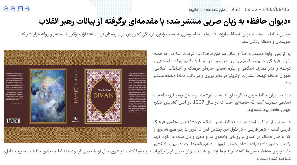 رونمایی از ترجمههای یونانی (لینک بایگانی)، سوئدی (لینک بایگانی)، ایتالیایی (لینک بایگانی) و اسپانیایی (لینک بایگانی) کتاب خاطرات خامنهای، ترجمه صربی سخنرانیهای خامنهای و انتشار کتابچه (لینک بایگانی) «دیدگاههای مقام معظم رهبری و شهروندان صرب درباره فلسطین» و انتشار «دیوان حافظ با مقدمهای برگرفته از بیانات رهبر انقلاب به زبان صربی» (لینک بایگانی) نمونههایی دیگر از فعالیتهای مراکز فرهنگی ایران در تبلیغ رهبر جمهوری اسلامی و دیدگاههایش هستند.