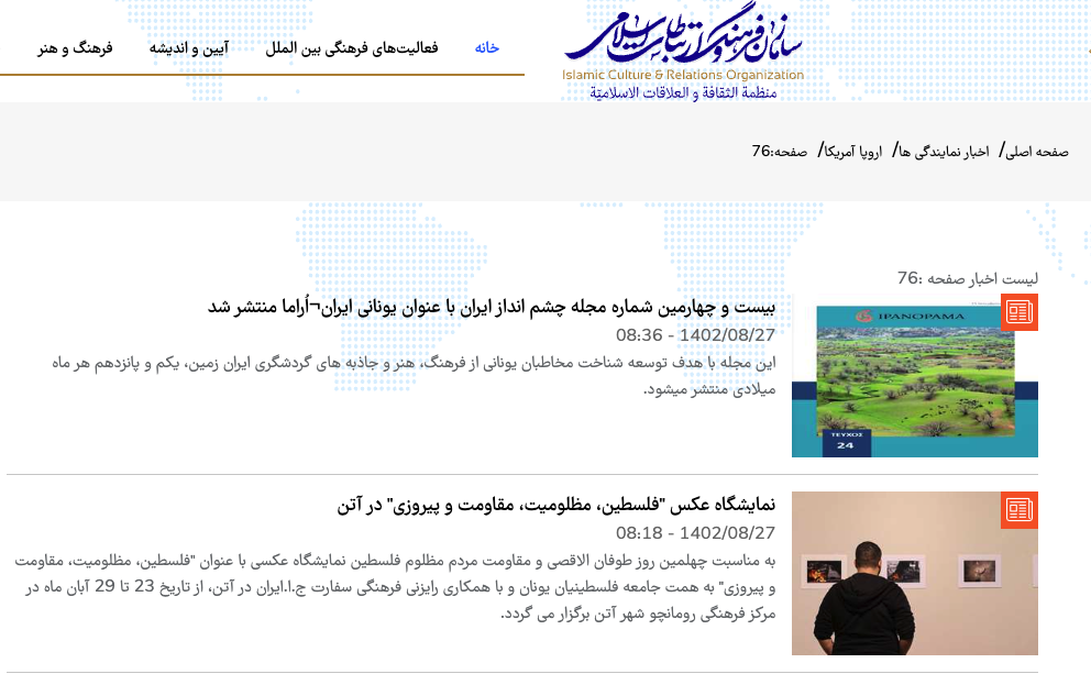 به عنوان نمونه در گزارشی (لینک بایگانی) که در تاریخ ۱۱ مهر ۱۴۰۳ در بخش اخبار سازمان فرهنگ و ارتباطات اسلامی منتشر شده به اجرای برنامه بزرگداشت سیدحسن نصرالله در کشورهای یونان، فرانسه، بلغارستان و روسیه اشاره شده است.
