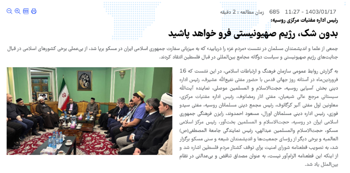 یا در یک نمونه دیگر که چند ماه بعد، دفتر فرهنگی سفارت ایران در مسکو محل برگزاری نشستی متشکل از رهبران مسلمان ساکن روسیه میشود. شرح صحبتهای حاضران در نشست در دست نیست، اما دفتر رایزنی فرهنگی ایران در روسیه در گزارش (لینک بایگانی) خود از این نشست، صحبتهای رئیس اداره مفتیات مسکو را تیتر میکند: «بدون شک، رژیم صهیونیستی فرو خواهد پاشید»