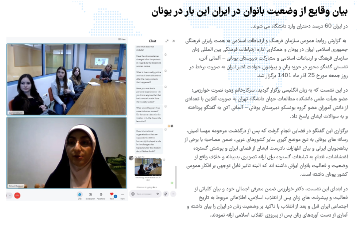 به عنوان نمونهای از رویکرد اول میتوان به گزارش یک نشست اشاره کرد که رایزنی فرهنگی جمهوری اسلامی در آتن با عنوان «بیان وقایع از وضعیت بانوان در ایران این بار در یونان» (لینک بایگانی) برگزار کرده است.