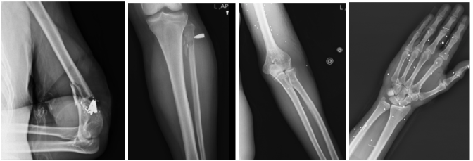 شکستگی خردشونده اطراف مفصل آرنج با حضور قطعات فلزی، شکستگیهای دیافیز استخوانهای ساعد با الگوی سازگار با نفوذ پرتابه، و پراکندگی متعدد ساچمهها در دست و مچ