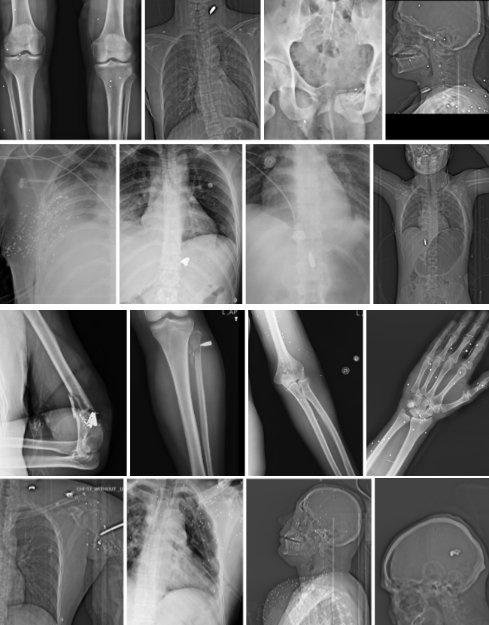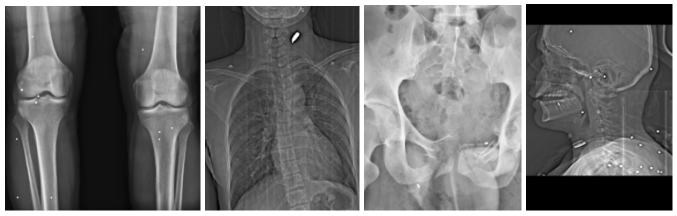 چهار نمونه از آسیبهای لگن، ران و مفصل ران که در سه تصویر با پراکندگی متعدد ساچمههای شاتگان در بافت نرم اطراف لگن و ران همراه است و در یک تصویر، تخریب شدید و شکستگی چندتکه استخوان ران با قطعات فلزی پرانرژی دیده میشود