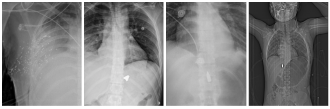 وجود لوله قفسه سینه در چند تصویر، بهعنوان نشانه مداخله اورژانسی برای پنوموتوراکس یا خون و هوا در فضای جنب، بهطور مستقیم شدت آسیب قفسه سینه و خطر آن را برجسته میکند. در بعضی موردها، لولهگذاری تنفسی و نیز گاز زیاد در معده بهعنوان قرینهای محتمل از احیای تنفسی یا اقدامات حمایتی پیشرفته ذکر شده است. همچنین گاز زیر پوست یا گاز در بافت نرم در چند آسیب نافذ، بهعنوان نشانه جراحت باز یا نافذ و همخوان با تروماهای ناشی از گلوله یا نفوذی توضیح داده شده است. این شاخصها، بهویژه وقتی کنار هم مینشینند، تصویر روشنتری از شدت تروما و سطح بحران پزشکی ارائه میدهند.