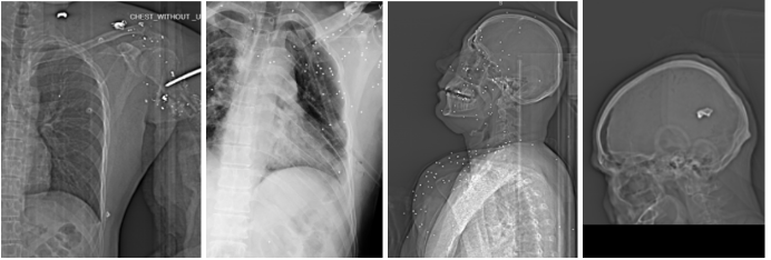در موارد مربوط به ساچمههای شاتگان، تصاویر معمولا چندین جسم فلزی کوچک با چگالی بالا را نشان میدهند که به صورت پراکنده یا خوشهای در بافت نرم، اطراف مفاصل یا در ناحیه صورت و سر قرار گرفتهاند. در برخی تصاویر، الگوی پراکندگی ساچمهها با یک «مخروط پراکندگی» سازگار است که میتواند با فاصله متوسط یا نزدیک شلیک همخوانی داشته باشد. در تصاویر این مجموعه، دامنهای از الگوهای پراکندگی دیده میشود؛ از خوشههای فشرده که با فاصلههای کوتاه سازگارند، تا پراکندگیهای وسیعتر که میتواند نشاندهنده فاصلههای متوسط یا بیشتر باشد. در برخی موارد، تمرکز ساچمهها بر یک ناحیه حیاتی خاص، مانند سر یا صورت دیده میشود. چنین تراکمی معمولا با انتقال انرژی بالا به بدن همراه است و میتواند منجر به خردشدگی استخوان، پارگی گسترده بافت نرم و در مواردی آسیبهای تهدیدکننده حیات شود. شدت این الگوها، بهویژه در نواحی سر، گردن و قفسه سینه، نشاندهنده اعمال نیروی قابل توجه است؛ هرچند شدت آسیب همواره تابع ترکیبی از فاصله، نوع مهمات، زاویه برخورد و وضعیت بدن فرد بوده است.