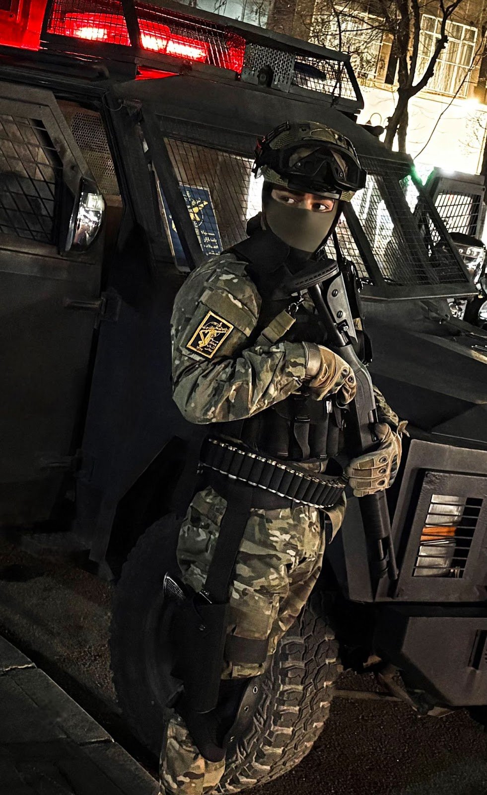 کپشن عکس: نیروی یگان امنیتی سپاه پاسداران انقلاب اسلامی مسلح به شاتگان Escort Aimguard TS و یک قبضه اسلحه کمری نیمهخودکار ۹ میلیمتری بر اساس الگوی CZ.52 در جریان اعتراضات سراسری اخیر.(منبع)