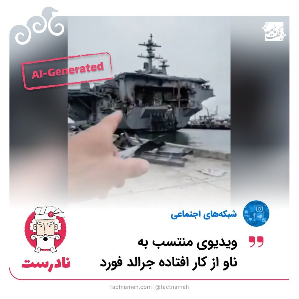 ۲. پیروزیهای نظامی ساختگی: تولید ویدیوهای جعلی و تصاویر ماهوارهای دستکاریشده برای به تصویر کشیدن حملات موفق به پایگاههای آمریکایی، سرنگونی هواپیماهای پیشرفته آمریکایی و اسرائیلی و آسیب شدید به ناوهای آمریکایی مانند ناو جرالد فورد. این در حالی است که خبرهای موثقی از عملیاتهای موفقیت آمیز ایران مخابره شده، اما عکس و ویدیوی چندانی از آنها وجود ندارد.