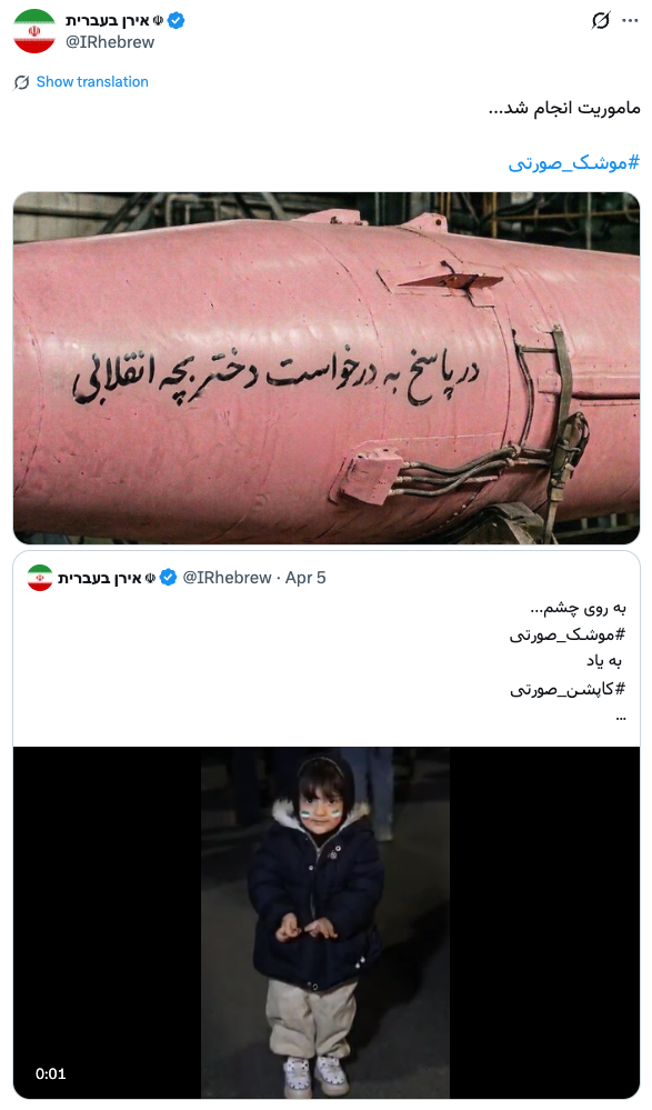 اکانت ایران به عبری (IRhebrew) عکس موشک صورتی را منتشر کرد و نوشت: «ماموریت انجام شد».